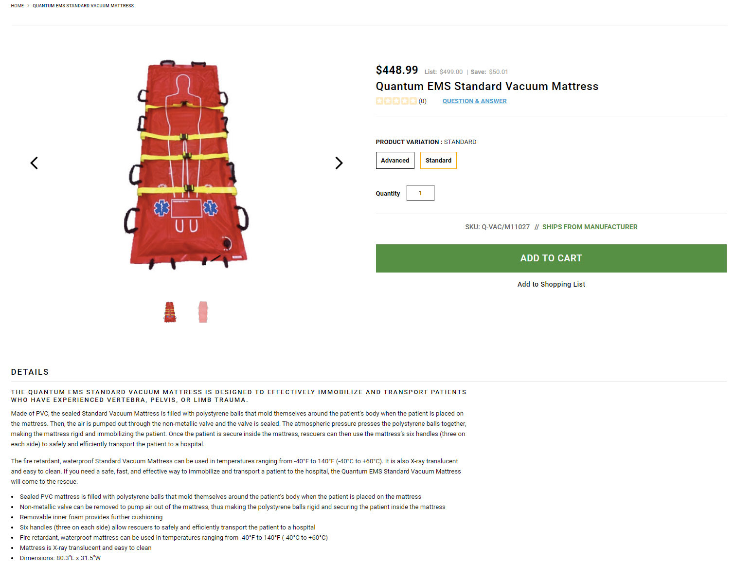 I created this product page that Witmer Public Safety Group's customers can use to learn about and purchase Quantum EMS's Standard Vacuum Mattress. I wrote a detailed description of the mattress's construction and protective features based on information I found on Quantum EMS's manufacturer website. I also downloaded an image of the mattress, edited it in Photoshop to eliminate excessive white space, and uploaded it to Witmer's Adobe Scene 7 image manager so they would display properly on the product page.