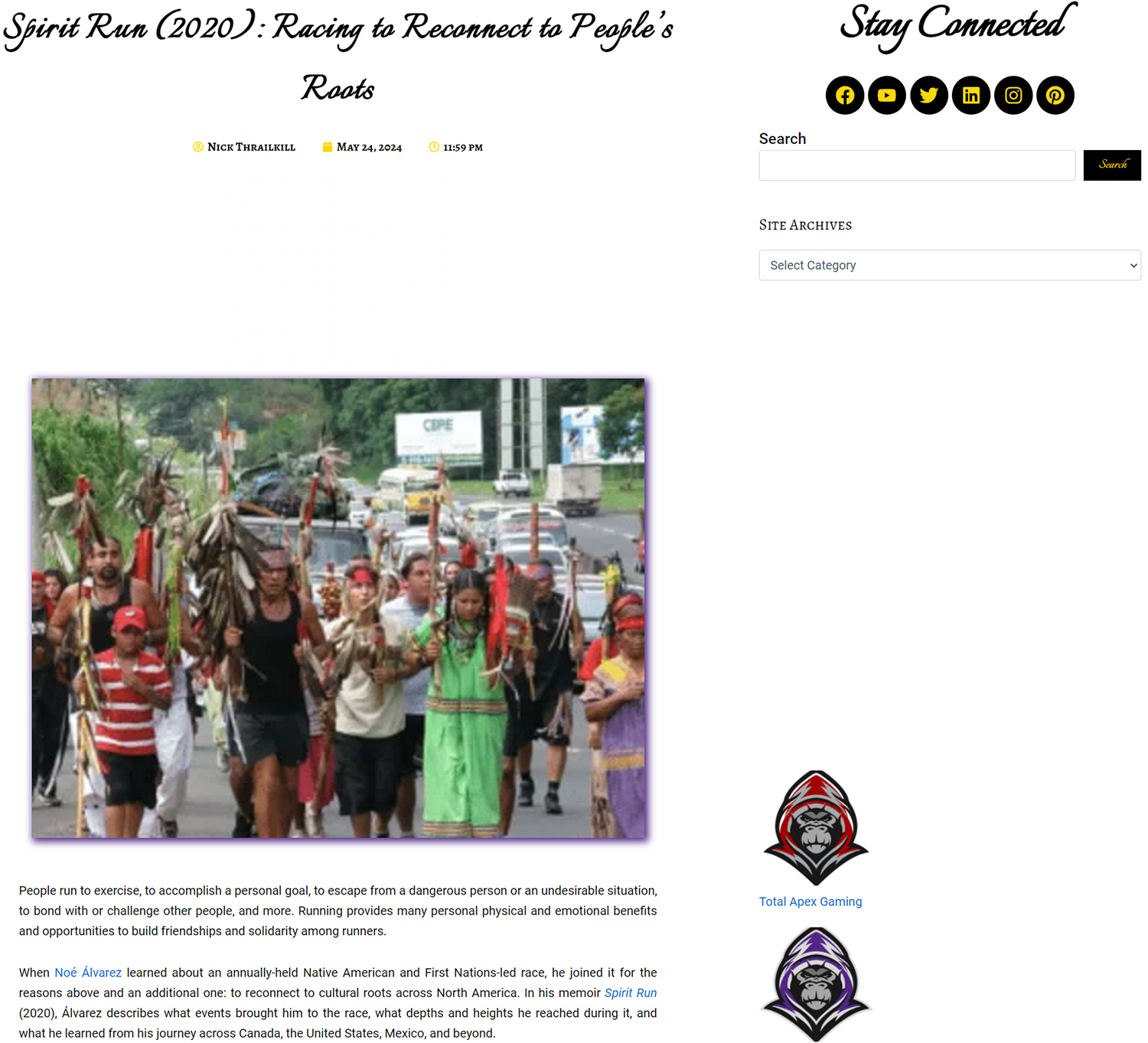 I ghostwrote this review of Noé Álvarez's book "Spirit Run" for Total Apex Entertainment, a company that publishes daily articles about anime, movies, television, books, music, and other forms of entertainment.